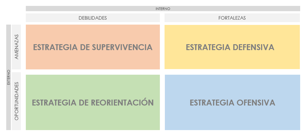 Por último, es necesario seleccionar la estrategia atendiendo a la matriz de confrontación resultante del DAFO; ya que el cruce entre Debilidades, Amenazas, Fortalezas y Oportunidades nos indicará el tipo de estrategia a seguir; así: